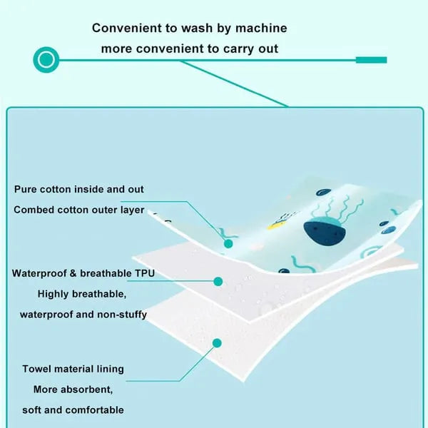 Safety Material: Waterproof and breathable diaper skirt with cotton outer and inner layers, featuring a 100% TPU waterproof middle layer for instant absorption and easy cleaning.